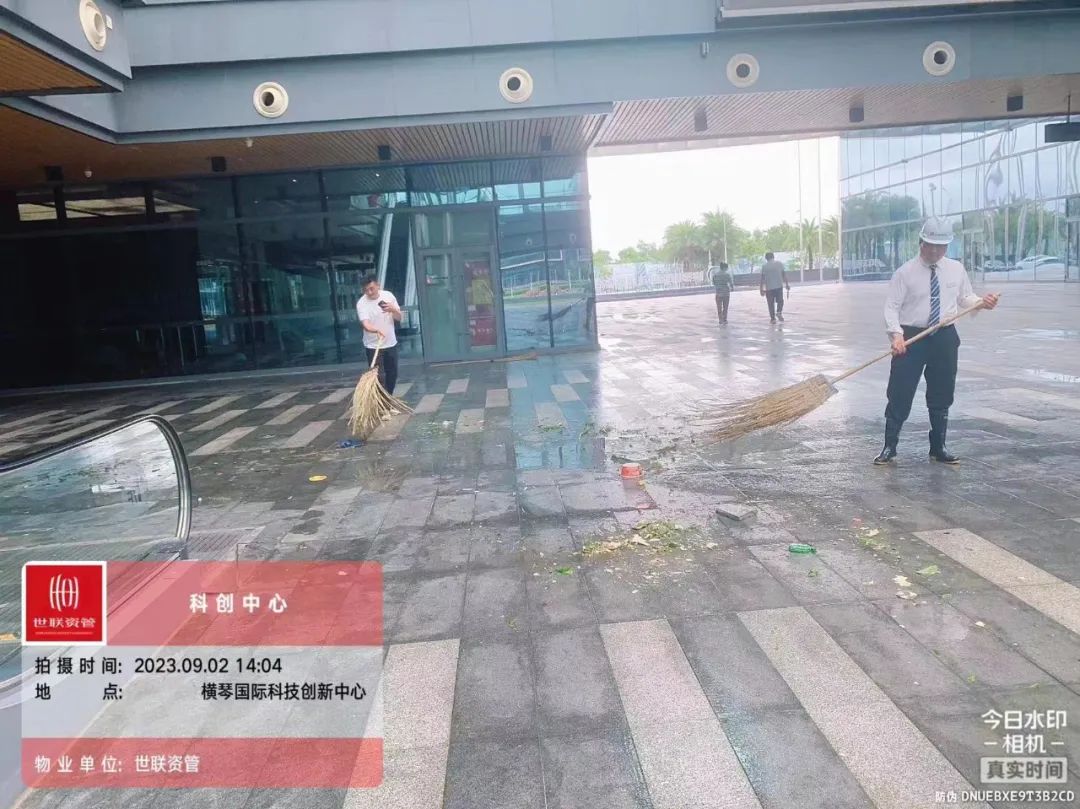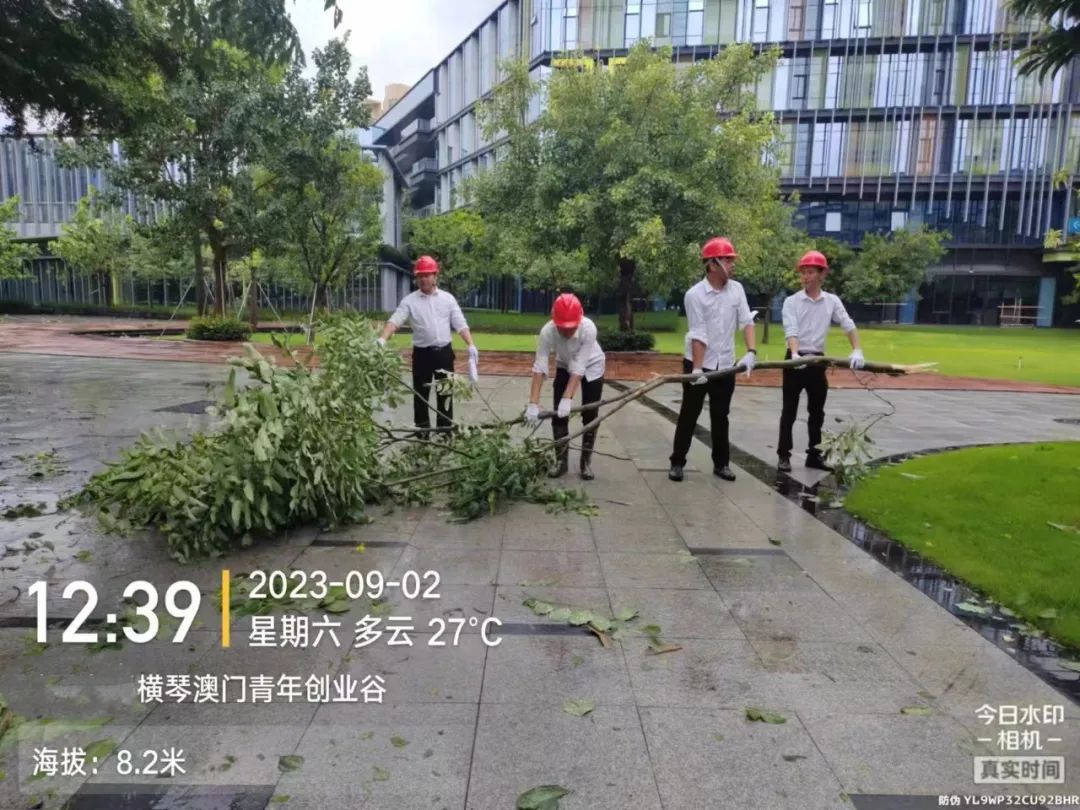 第一時間對園區(qū)環(huán)境進(jìn)行清障復(fù)原,完成園區(qū)所有枯樹樹葉清理、樹木扶正,樹撐檢查加固;完成園區(qū)公共垃圾桶、煙灰柱、地毯復(fù)原工作;檢查受災(zāi)情況并進(jìn)行修復(fù),檢查設(shè)備機(jī)房、電梯是否正常運行等,確保企業(yè)可正常辦公。其中橫琴國際科創(chuàng)中心園區(qū)應(yīng)急避難場所本次接待人員約1500人次,產(chǎn)生生活垃圾約3噸,人員撤離后已及時清理。