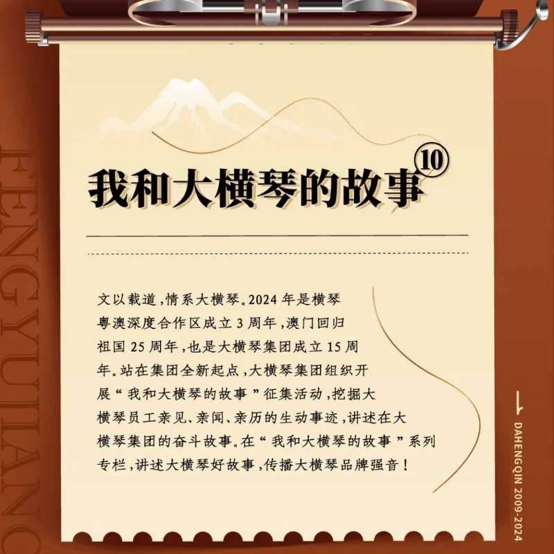 文以載道,情系大橫琴。2024年是橫琴粵澳深度合作區成立3周年,澳門回歸祖國25周年,也是大橫琴集團成立15周年。站在集團全新起點,大橫琴集團組織開展“我和大橫琴的故事”征集活動,挖掘大橫琴員工親見、親聞、親歷的生動事跡,講述在大橫琴集團的奮斗故事。大橫琴集團公眾號將陸續推出“我和大橫琴的故事”系列專欄,講述大橫琴好故事,傳播大橫琴品牌強音!